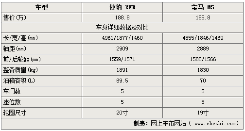 為了滿足豪華車的乘坐舒適,兩款車均增加了整車的長度及軸距,雖然令轉向半徑有所增加但是相應的行駛穩(wěn)定亦有所提升。從外觀尺寸上來看,寶馬M5因軸距略遜于捷豹XFR而顯得車內空間不夠寬裕。雖然在豪華以及性能表現上相差無幾,但從大尺寸輪轂的配置即可感受到XFR濃濃的運動氣息,更傾向于突出跑車特質。