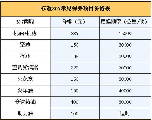 5.保養(yǎng)費: 我們向標(biāo)致4S店售后服務(wù)人員咨詢過,他們說307一大優(yōu)勢是保養(yǎng)周期比較長,1.5萬公里才需要保養(yǎng)一次,是同級車型中保養(yǎng)花費最低的。通常新車首保在7500公里時進(jìn)行,以后每1.5公里保養(yǎng)一次。第二次1.5萬公里時的常規(guī)保養(yǎng)(更換機油機濾)需花費287元;3萬公里保養(yǎng)(更換機油機濾+空濾+空調(diào)濾芯+汽濾+火花塞)為795元;4.5萬公里保養(yǎng)(更換機油機濾)花費287元;6萬公里保養(yǎng)(更換機油機濾+空濾+空調(diào)濾芯+汽濾+火花塞)為795元。