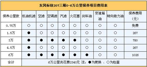 5.保養(yǎng)費: 我們向東風標致4S店售后服務人員咨詢過,東風標致207 三廂保養(yǎng)周期為1.5萬公里,首保在7500公里時進行。免費對各種配件進行檢查。1.5萬公里和4.5萬公里時都只需要進行普通保養(yǎng)(更換機油機濾),3萬公里保養(yǎng)時需要更換機油機濾和三濾以及火花塞;6萬公里時除了有和3萬公里相同的項目外,還需更換剎車油。6萬公里綜合下來下來一共需要花費2340元,平均一年兩萬公里保養(yǎng)費用大概780元。