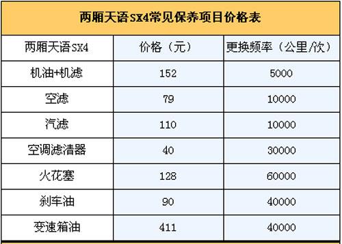 4.保養(yǎng)費(fèi):我們向長(zhǎng)安鈴木4S店售后服務(wù)人員咨詢過(guò),廠家規(guī)定天語(yǔ)SX4的首保時(shí)間為兩個(gè)月或者1500~2500公里(以先到為準(zhǔn)),正常保養(yǎng)周期為5000公里,假設(shè)一年跑2萬(wàn)公里,一年則需要做保養(yǎng)4次。第一次常規(guī)保養(yǎng)(只更換機(jī)油機(jī)濾,首保免費(fèi))費(fèi)用為152元;第二次(更換機(jī)油機(jī)濾+空氣濾芯+汽油濾芯)為341元;第三次常規(guī)保養(yǎng)(更換機(jī)油機(jī)濾)152元;第四次(更換機(jī)油機(jī)濾+空氣濾芯+汽油濾芯+變速箱油)為411元,此外空調(diào)濾芯3萬(wàn)公里更換,剎車油4萬(wàn)公里更換,那么2年/4萬(wàn)公里的保養(yǎng)費(fèi)用為2242元,平均一年兩萬(wàn)公里需花費(fèi)為1121元左右。