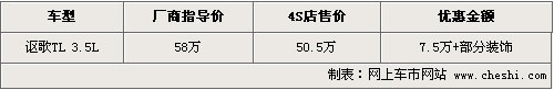 09新款的謳歌TL在去年12月份正式進(jìn)入國內(nèi)市場銷售,相比之前老款車型,09款在外觀、性能、排量上均有不同程度的提升。目前這款車可以優(yōu)惠現(xiàn)金7.5萬元,同時(shí)還有部分裝飾贈(zèng)送,具體行情如下: