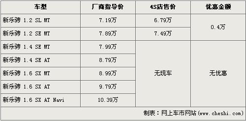 雪佛蘭-新樂騁是上海通用于去年3月份上市的小排量車型,也是運(yùn)用到雪佛蘭新家族特征的首輛車型。新樂騁全系分為1.2L、1.4L、1.6L三種排量,排量的多選化為喜歡小排量?jī)蓭囆偷挠脩籼峁┝烁S富的選擇。近日根據(jù)網(wǎng)上車市價(jià)格監(jiān)測(cè)系統(tǒng)顯示,雪佛蘭新樂騁出現(xiàn)了4000元的優(yōu)惠,具體價(jià)格詳情請(qǐng)看下表: