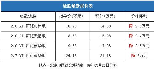 近期國內(nèi)市場SUV車型再次升溫,4月份銷量較上月有大幅增加,其中途勝4月份銷量高達(dá)4050輛,排在SUV銷量榜第四位。我們從北京地區(qū)的一家北京現(xiàn)代綜合經(jīng)銷商處了解到,09款途勝全系車型的優(yōu)惠在2.3-3萬元區(qū)間,價(jià)格和三月初基本相同,只有2.7手動(dòng)四驅(qū)豪華型的價(jià)格比月初下降了2000元,優(yōu)惠金額增加到了3萬元。以下是09款途勝最新詳細(xì)報(bào)價(jià)表: