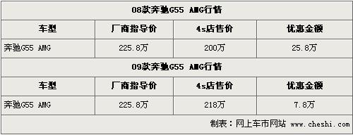 根據(jù)北京奔馳4S店銷售人員介紹,目前店內(nèi)可以接受09款奔馳G55 AMG的預訂,訂金為10萬元,并且近期預訂奔馳G55 AMG的消費者可以得到7.8萬元的優(yōu)惠,經(jīng)優(yōu)惠后售價從225.8萬元下降到了218萬元。銷售人員還介紹,08款的奔馳G55 AMG還有少量的庫存車,并且有高達25.8萬元的優(yōu)惠,經(jīng)優(yōu)惠后08款的售價降到了200萬元。