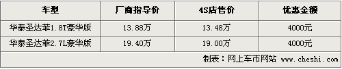 圣達(dá)菲在國內(nèi)上市的時間較早,共推出了2.0L柴油和2.7L汽油兩個排量車型,而最新的1.8T車型在價格和配置上都具備了較高的性價比。目前北京地區(qū)只有汽油版車型有售,并且有一定的優(yōu)惠幅度,具體行情如下:
