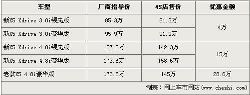 寶馬全新X5于去年7月上市,此車的上市為競爭激烈的高性能運動型多功能車(SAV)細(xì)分市場再次在操縱靈活性方面制定起新的標(biāo)準(zhǔn)。全新寶馬共有3.0L及4.8L兩個排量選擇,價格區(qū)間為83.7萬元-173.6萬元。近日根據(jù)網(wǎng)上車市價格檢測系統(tǒng)顯示:寶馬X5全系最高優(yōu)惠金額達(dá)28.6萬元,具體詳情請看下表: