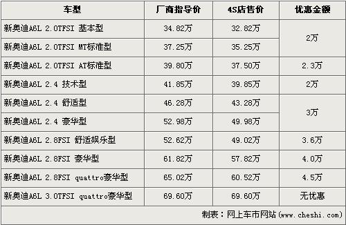 在奧迪家族中,A6L是非常重要的一款商務(wù)車型,新款奧迪A6L通過外觀和安全等方面的改款升級,在同級別車型中擁有了更高的性價比,入門級車型價格更能夠比拼寶馬5系等對手。根據(jù)網(wǎng)上車市價格監(jiān)測系統(tǒng)顯示,目前A6L最高優(yōu)惠達到了4.5萬元,具體行情如下: