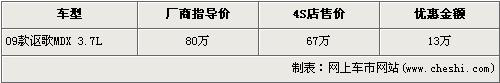 謳歌-MDX于07年4月13日于北京上市,MDX是本田高端品牌謳歌引進(jìn)中國(guó)的第一輛豪華SUV車型。事隔1年有余,小改款的09款謳歌-MDX又被推出,其在08款的基礎(chǔ)上增加了一些實(shí)用性的配件,動(dòng)力方面則沒有任何變動(dòng)。近日據(jù)網(wǎng)上車市價(jià)格數(shù)據(jù)監(jiān)測(cè)顯示,謳歌MDX的現(xiàn)金優(yōu)惠增加到了13萬(wàn)元,具體詳情請(qǐng)看下表: