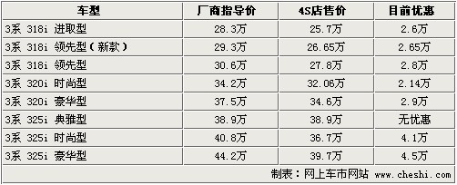 據(jù)4S店銷售人員介紹:寶馬3系推出一款新318i領(lǐng)先型,目前318i領(lǐng)先型共有2款,但是配置有所不同。新款車型相比在售的30.6萬元的車型配置有所降低,但是相比318i進取型多了幾項實用配置,但優(yōu)惠后的價格僅比318i進取型價格高了不足1萬元。目前寶馬3系318i全系無現(xiàn)車,預(yù)定需等到11月底、12月份才能到車,顏色為黑色。320i目前時尚型有現(xiàn)車,顏色為紅色,豪華型需預(yù)定。寶馬3系全系最高優(yōu)惠4.5萬元,相對優(yōu)惠價格較穩(wěn)定。