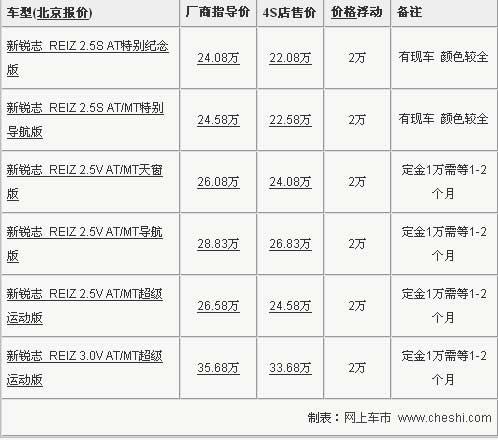 據北京一汽豐田4S店銷售人員介紹,目前銳志全系優(yōu)惠2萬元,銳志 REIZ 2.5S AT特別紀念和2.5S AT/MT特別導航版有現車供應,且顏色較全,其余高配車型均需要預定。銷售人員還表示:現車的顏色有銀、白、黑、紅可供選擇,有現車的這兩款車型是豐田銳志賣的最火的也是性價比最高的兩款車型。消費者交定金1萬等待1-2個月便可提車。北京地區(qū)各4S店由于訂單不同,各店銷售的現車顏色有所不同。