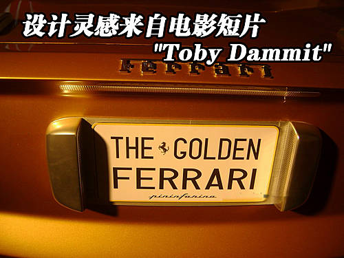 這輛黃金法拉利,除了"Golden Ferrari"這個(gè)直白的綽號(hào)外,其他部分完全未知。從外表判斷,黃金法拉利基于599 GTB,但實(shí)際上Pininfarina的設(shè)計(jì)靈感來(lái)自于某電影短片"Toby Dammit"中出現(xiàn)的法拉利330 LMB。