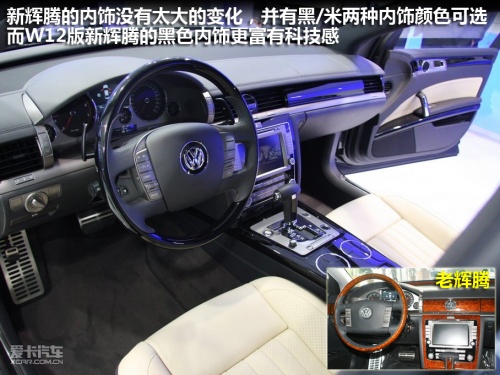 與它經(jīng)過少許修改的外觀不同,新輝騰的內飾幾乎沒有變化,整車主要有兩種配色:原木色+米色與黑+銀色可選。車內的設計、布局與老款車型完全相同,新輝騰W12版車型采用黑銀色內飾+米色座椅,與典雅的V8車型所采用的原木色相比更富有冷冷的科技感。