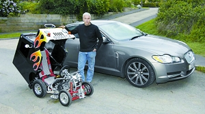 這輛世界最小汽車高約99厘米、寬約66厘米。小車通體黑色,車前端畫著象征速度的火焰圖案。制造者佩里·沃特金斯現(xiàn)年47歲,是一名不折不扣的汽車迷,三次打破全球最矮汽車紀(jì)錄。不過,不到1米的小車對(duì)身高超過180厘米的沃特金斯來說實(shí)在太小,他不得不施展“柔術(shù)”才能塞進(jìn)車?yán)铩?/p>