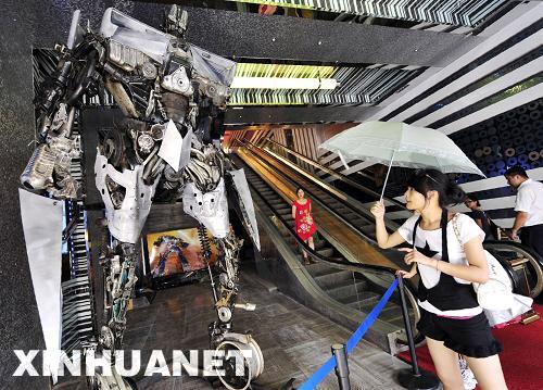 6月23日,觀眾在杭州一家電影院觀看“汽車人”。這個“汽車人”高逾4米,重達2噸,由各種廢棄汽車零件焊接組裝而成,是為即將上映的電影《變形金剛2》造勢特別制作的。新華社發(fā)(李忠 攝)