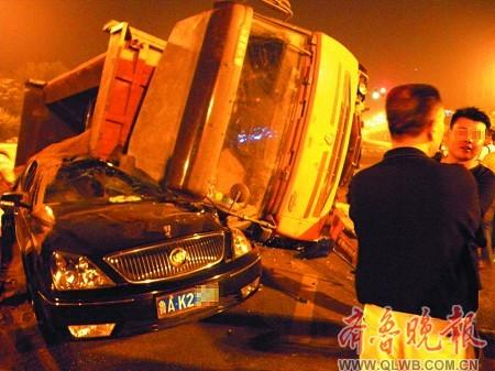 6日凌晨1時許,在濟南經(jīng)十路與千佛山路交叉口,一輛滿載沙子的斯太爾大貨車與一輛小轎車相撞,大貨車側翻將小轎車壓在了身下,沙子撒了一地,汽油從油箱里漏了出來,在路面上形成了很大一片油漬。小轎車的駕駛員位置被大貨車壓扁,車身后部則被沙子掩埋。