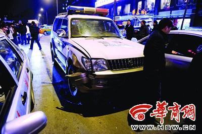目擊者宋先生說,下午5時30分,這輛警車在高新四路通往西大桃園校區(qū)的路上自西向東行駛,與一輛福特車迎面相撞,之后并沒停車,拐入另一車道繼續(xù)行駛,撞上一同向行駛的出租車車尾。警車仍沒停,又與兩輛轎車先后迎面相撞,被卡在兩車間停下來。警車上下來一男子,被撞轎車司機稱,“那人身上一股酒味!彪S后,司機被交警帶走。有一男兩女來到現(xiàn)場,自稱是警車司機的朋友,一女子卸下了警車車牌后,3人離開。