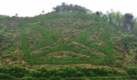 從圖上可以看出,一面數(shù)千平米的山坡上,數(shù)千棵樹木排列成奇怪而規(guī)則的圖案——一個(gè)規(guī)則的方框內(nèi)三個(gè)獨(dú)立的小三角,將空間劃分開來,看線條,極似“X”,與旁邊野生的樹木形成鮮明對比。初步判斷,“神秘林”絕非天然形成。據(jù)當(dāng)?shù)厝罕姺从,神秘樹陣的所在地確實(shí)是在武功山,處于安?h北側(cè)的北華山附近。樹林是幾天前出現(xiàn)的,但為什么是這個(gè)圖案,當(dāng)?shù)厝税偎疾坏闷浣狻!霸瓉聿]有相似的事情發(fā)生”一位李姓村民說道,“最近大家都開始議論這是不是所謂的麥田怪圈!”