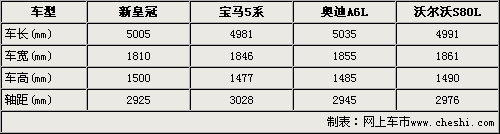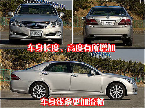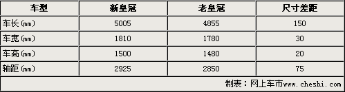 通過上表我們可以清楚的看出,豐田新皇冠車型尺寸與老款車型相比,長、寬、高分別增加了150mm、30mm和20mm。同時(shí)軸距也較老款車型加長了75mm。車身加大和軸距加長后得到的是更舒適的后排乘坐空間,車身變長對操控感會有一定的影響。