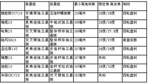 SUV車(chē)主要的任務(wù)不是去真正的越野探險(xiǎn),在提供舒適的前提下,它只需具備一定的通過(guò)能力,從這些SUV車(chē)的懸掛就能看出這一點(diǎn)。在這一點(diǎn)上,表格中的8款SUV車(chē),除了陸風(fēng)的X6在性能上偏向越野車(chē)之外,其余各款車(chē)型,均以追求舒適為主。