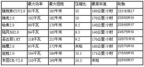 我們從廠家了解到,新旗勝已經(jīng)全面上市,動(dòng)力分為2.0升和2.4升兩個(gè)系列,分為兩驅(qū)和四驅(qū)共6個(gè)車(chē)型。外形看,這是一款頗為漂亮的車(chē)子,外形、做工和配置,與其售價(jià)很是不符。為了讓大家對(duì)其有所了解,這里把新旗勝和同級(jí)的幾款自主品牌SUV以及小一個(gè)級(jí)的SUV(比如瑞虎)做一番簡(jiǎn)單對(duì)比。為了參考的更全面,還把包括本田CR-V在內(nèi)的幾款合資車(chē)同時(shí)排列,盡管它們所面對(duì)的,并非同一個(gè)市場(chǎng),特別是像本田這樣的車(chē)型,與自主品牌相比,品牌價(jià)值差異較大,不能做直接對(duì)比,只能是個(gè)參考。