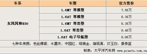 1月27日,備受期待的東風風神首款精品兩廂車東風風神H30,以“從容進取、自由人生”為產(chǎn)品主張,在“自由之都”——成都拉開了全國自由上市帷幕。東風汽車公司副總經(jīng)理、東風乘用車公司總經(jīng)理李紹燭公布了東風風神H30五款上市車型的價格:1.6MT尊雅型7.58萬元,1.6MT尊貴型8.38萬元,1.6AT尊雅型8.38萬元,1.6AT尊貴型9.48萬元,1.6AT 電子導航型9.98萬元。