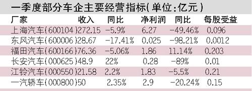 中國汽車工業(yè)協(xié)會的統(tǒng)計(jì)數(shù)據(jù)顯示,今年一季度汽車產(chǎn)銷256.76萬輛和267.88萬輛,同比增長1.91%和3.88%。盡管結(jié)束了去年四季度銷量下降趨勢,但從部分披露一季報的上市公司來看,由于一季度汽車銷量增長主要是受小排量車和微客的帶動,而這兩類車單車?yán)麧櫰,利潤豐厚的B級車出現(xiàn)了滯銷情況,導(dǎo)致大量車企出現(xiàn)“增產(chǎn)不增收”的怪現(xiàn)象,利潤同比下降近五成,東風(fēng)和長安的凈利潤下降了八九成,只有個別企業(yè)出現(xiàn)一定車程度的增長。