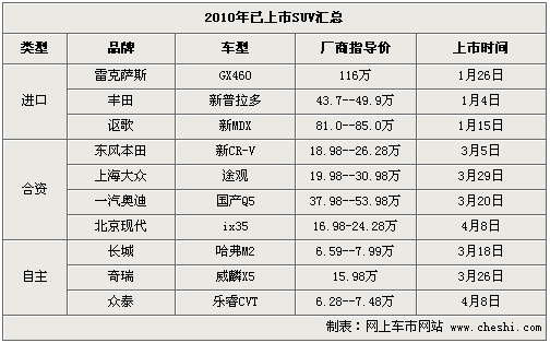 從年初至今,已經(jīng)上市的SUV車型達到了10款之多,而3月上市的就占到5款。其中上海大眾途觀在上市預售首月訂單就突破了4萬輛的;隨后上市的國產(chǎn)奧迪Q5訂單已經(jīng)排到明年,目前購買這兩款車仍需要加2.5萬-3萬元才能提到現(xiàn)車。而4月8日上市的iX35則又將在日系車市場掀起一股搶購熱潮。
