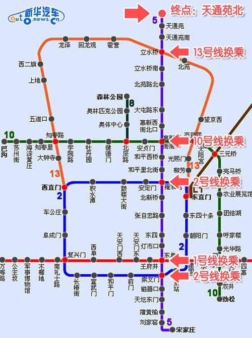 車展專線1號(hào)線的始發(fā)站是地鐵5號(hào)線的終點(diǎn)站,天通苑北站。家住天通苑北的同志們上班遠(yuǎn)一點(diǎn),可是看車展就比較方便了。乘坐地鐵的換乘路線如下圖所示: