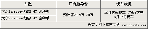 與六代高爾夫同平臺(tái)的大眾Scirocco尚酷轎跑車,自從在廣州車展上正式發(fā)布以后,引起眾多車友的極大關(guān)注,這款車采用了大眾IROC概念車的大量設(shè)計(jì)元素,是一款既彰顯時(shí)尚前衛(wèi)的運(yùn)動(dòng)氣質(zhì)又能滿足駕駛者日常功能需求的全能轎跑車。根據(jù)網(wǎng)上車市價(jià)格監(jiān)測(cè)系統(tǒng)顯示,目前尚酷展車已經(jīng)到店,本月底現(xiàn)車也將陸續(xù)到店,4S店開始接受消費(fèi)者預(yù)訂,具體行情如下: