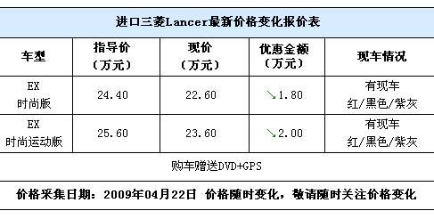 筆者近日從北京港龍基業(yè)經(jīng)銷(xiāo)商處獲悉,進(jìn)口三菱Lancer EX車(chē)型保持著最高2萬(wàn)元的優(yōu)惠,并且近期購(gòu)車(chē)還將獲贈(zèng)DVD+GPS,現(xiàn)時(shí)尚型和時(shí)尚運(yùn)動(dòng)型現(xiàn)車(chē)充足,紅,黑,紫灰等常見(jiàn)顏色均有現(xiàn)車(chē),感興趣的朋友可以與經(jīng)銷(xiāo)商聯(lián)系,詳細(xì)價(jià)格信息請(qǐng)見(jiàn)下表: