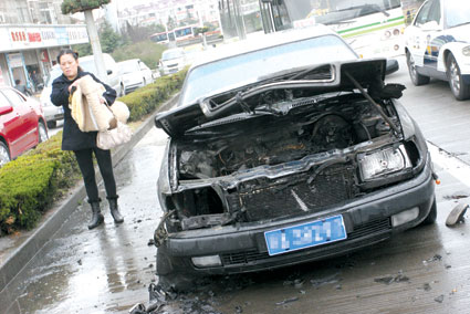 下了車后,謝先生急切地想知道發(fā)生了什么,使勁拉了拉發(fā)動(dòng)機(jī)艙蓋,就是打不開(kāi)。兩分鐘后,車子燃起了大火,周圍已是濃煙滾滾!坝腥四脕(lái)了4個(gè)滅火器,對(duì)著車子直噴,不過(guò)火勢(shì)太大了,根本滅不了!敝x先生說(shuō),看著自己的車子一點(diǎn)點(diǎn)地被大火吞噬,他簡(jiǎn)直欲哭無(wú)淚。最后消防隊(duì)趕到了現(xiàn)場(chǎng),才把大火撲滅。