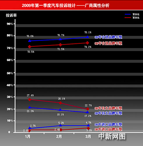 中新網(wǎng)4月24日電 日前,中國質(zhì)量協(xié)會用戶委員會、車人網(wǎng)聯(lián)合發(fā)布了2009年一季度中國汽車產(chǎn)品質(zhì)量與服務(wù)質(zhì)量分析報(bào)告。統(tǒng)計(jì)顯示,相比去年同期,合資品牌車型的投訴增加較快,進(jìn)口車投訴略有增加,自主品牌車型的投訴呈現(xiàn)遞減趨勢。