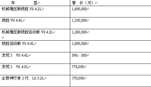 中新網(wǎng)11月8日電 近日,記者獲悉,路虎主力產(chǎn)品08款攬勝運動版正式登陸北京、華北、西北、西南市場,其中4.4升V8汽油自然進氣版價格為109萬元,4.2升V8機械增壓版價格為128萬元。經(jīng)銷商處現(xiàn)已接受預(yù)訂,訂金為5萬元。