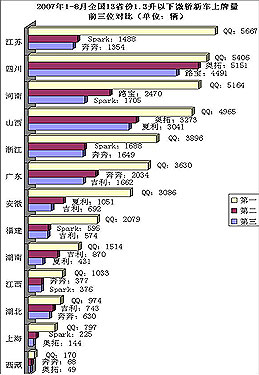 按07年1-8月份新車上牌量累計,QQ系列轎車在安徽、福建、廣東、河南、湖北、湖南、江蘇、江西、山西、上海、四川、西藏、浙江13個省級行政區(qū)均榮膺微型轎車銷售第一,將夏利、奔奔、路寶、奧拓、Spark等微轎競品拋在后面。