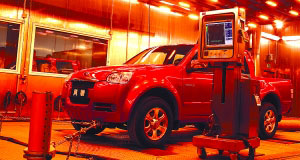 一輛風(fēng)駿皮卡安靜地停在一間大房子內(nèi),天花板上的幾臺(tái)高功率射燈讓它看上去光彩照人。但過(guò)不了多久,這些大燈就會(huì)讓風(fēng)駿暴露在強(qiáng)烈的“熱帶陽(yáng)光”之下,接下來(lái),這輛倒霉的實(shí)驗(yàn)車可能還要在模擬行駛的狀態(tài)下接受從零上40度到零下60度環(huán)境溫度變化的考驗(yàn)。