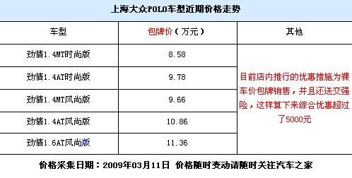 近期小型車市場可以說是大事不斷,峰范、嘉年華的先后上市都對這一市場的格局造成了一定的影響,而作為這一系列的主力車型之一的POLO車型也不甘示弱。近期,筆者通過深圳地區(qū)的上海大眾經(jīng)銷商處了解到,目前POLO 勁情車型在深圳地區(qū)的優(yōu)惠措施為裸車價包牌銷售,即相當(dāng)于免除了購置稅、上牌費等一系列費用,并且還送交強險。具體詳情請見下表: