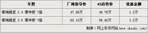 據(jù)4店銷售人員介紹,目前銷售的普瑞維亞車型只有2.4豪華版7座和3.5豪華版7座兩款車型。經(jīng)1.2萬元優(yōu)惠后,2.4L豪華7座版售價(jià)從47.98萬元降到了46.78萬元,而3.5L豪華7座版經(jīng)全系最高的3.2萬元優(yōu)惠后,售價(jià)由60.10萬元降到了56.90萬元。銷售人員還介紹,兩款車型現(xiàn)車齊全,消費(fèi)者挑選的空間較大。