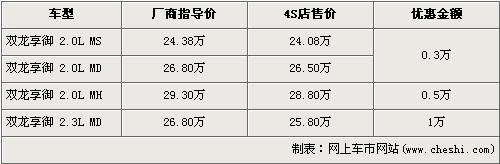 憑越野車(chē)起家的雙龍,向來(lái)是以生產(chǎn)SUV而著稱的,旗下的雙龍享御更是其的代表之作,其2.0L車(chē)型搭載的柴油發(fā)動(dòng)機(jī)更是源于奔馳的技術(shù)。雙龍享御共有四款車(chē)型,售價(jià)區(qū)間為24.38萬(wàn)元-29.30萬(wàn)元。近日根據(jù)網(wǎng)上車(chē)市價(jià)格監(jiān)測(cè)顯示,雙龍享御全系最高優(yōu)惠1萬(wàn)元,詳情請(qǐng)看下表: