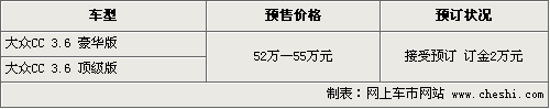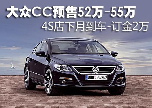大眾CC自去年廣州車展亮相后一直受到消費(fèi)者廣泛關(guān)注,此前有關(guān)這款車的詳細(xì)參數(shù)和配置已經(jīng)曝光。大眾CC將搭載3.6FSI燃油直噴引擎和6速DSG雙離合變速箱,將分豪華版和頂級(jí)版兩款。根據(jù)網(wǎng)上車市價(jià)格監(jiān)測系統(tǒng)顯示,目前這款車有望在下月到店,4S店開始接受消費(fèi)者預(yù)訂,具體行情如下:
