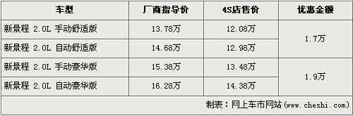 根據(jù)經(jīng)銷商處銷售人員介紹,“大嘴”新景程2.0L舒適版現(xiàn)金優(yōu)惠從1.9萬元下降到了1.7萬元,豪華版車型優(yōu)惠也從2萬元小幅下降到了1.9萬元。經(jīng)優(yōu)惠后,舒適版的手動與自動車型售價分別回升了12.08萬元及12.98萬元,豪華版車型的手動與自動車型售價也漲到了13.48萬元和14.38萬元。銷售人員還表示,目前店內(nèi)現(xiàn)車充足,顏色也全,消費(fèi)者自由挑選的空間變得更加便利,更加自由。