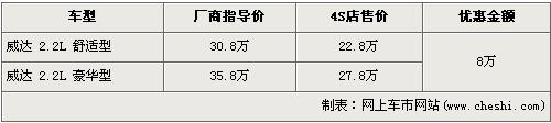 據(jù)經(jīng)銷商銷售人員介紹,威達(dá)全系現(xiàn)金優(yōu)惠8萬(wàn)元。目前歐寶威達(dá)僅2.2L舒適版和2.2L豪華版兩款車型在銷售,經(jīng)優(yōu)惠8萬(wàn)元后,2.2L豪華型售價(jià)降到了27.8萬(wàn)元,2.2L舒適型首次跌破23萬(wàn),售價(jià)僅為22.8萬(wàn)元,F(xiàn)車的數(shù)量一般顏色也不是很齊全,消費(fèi)者挑選的余地很受限制。
