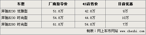 據(jù)4S店銷售人員介紹,目前奔馳E級(jí)現(xiàn)車都較為緊張,多數(shù)是訂單式的銷售方式。因?yàn)镋級(jí)將推出改款車型,所以目前的優(yōu)惠幅度相對(duì)較大,其中E230時(shí)尚型最高優(yōu)惠達(dá)到了10萬(wàn)元,E230降幅也在9萬(wàn)元,E280時(shí)尚型優(yōu)惠7萬(wàn)元后售價(jià)僅為54.8萬(wàn)元。目前只有個(gè)別4S店內(nèi)有少量銀色和黑色現(xiàn)車供應(yīng),其他店均需要訂車。對(duì)想購(gòu)買E級(jí)車的消費(fèi)者而言,現(xiàn)在出手是最好的時(shí)機(jī)。