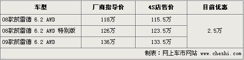 凱雷德是凱迪拉克家族一款大尺寸的SUV產品,結合6.2的大排量,從內而外都給人粗曠和厚實的感覺。其搭載的全新的6前速手自一體自動變速箱非常適用于低轉速高速巡航,也極大提高了瞬間的加速性能。根據網上車市價格監(jiān)測系統(tǒng)顯示,目前凱雷德優(yōu)惠2.5萬元,具體車型以及價格如下: