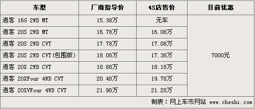 東風(fēng)日產(chǎn)逍客作為一款掀背車(chē)、SUV、交用轎車(chē)的交叉車(chē)型,去年3月份上市后一直受到消費(fèi)者關(guān)注,逍客不僅擁有時(shí)尚的外觀,良好的通過(guò)性,其搭載的日產(chǎn)新一代直列4缸MR20DE引擎匹配新一代CVT變速箱,使整車(chē)其具備了良好的燃油性。根據(jù)網(wǎng)上車(chē)市價(jià)格監(jiān)測(cè)系統(tǒng)顯示,目前這款車(chē)全系優(yōu)惠幅度由原來(lái)5000元增加到了7000元,具體行情如下: