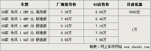 據(jù)4S店銷(xiāo)售人員介紹,目前銷(xiāo)售的樂(lè)風(fēng)為09款車(chē)型,主要包括1.2和1.4兩個(gè)排量,1.6排量車(chē)型廠家尚未排產(chǎn)。目前購(gòu)買(mǎi)樂(lè)風(fēng)1.2排量可以?xún)?yōu)惠5000元現(xiàn)金,最低僅售6.89萬(wàn)元。1.4排量全系列優(yōu)惠現(xiàn)金1萬(wàn)元,頂配自動(dòng)檔車(chē)型優(yōu)惠后售價(jià)不足8萬(wàn)元。在外觀顏色上,目前有藍(lán)色,銀色,紅色可供消費(fèi)者選擇,內(nèi)飾均為米色。