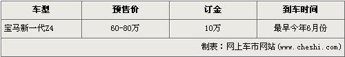 據北京寶馬經銷店銷售人員介紹,將引進國內的全新一代寶馬Z4分為sDrive30i和sDrive35i兩種車型,售價預計為60-80萬元。目前店內可以接受新Z4的預訂,訂金為10萬元。寶馬Z4 sDrive35i車型搭載了與寶馬X6 35i相同的3.0升雙渦輪直6引擎,最大功率達到了225Kw,最大扭矩達到了400Nm,F(xiàn)車方面銷售人員透露,最早的一批現(xiàn)車最快將會在6月份抵達北京寶馬經銷店,車型應該為sDrive30i,交訂金的消費者將會第一時間提到現(xiàn)車。