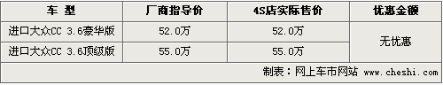據(jù)4S店銷售人員介紹,目前進(jìn)口大眾CC現(xiàn)車已經(jīng)到店,共分兩款車型,3.6豪華版售價(jià)為52萬(wàn)元,頂級(jí)版售價(jià)為55萬(wàn)元。這兩款車主要差別體現(xiàn)在配置上,頂級(jí)版增加了導(dǎo)航和自動(dòng)泊車系統(tǒng)等高端配置。消費(fèi)者現(xiàn)在購(gòu)車的話暫時(shí)還沒有優(yōu)惠幅度出現(xiàn)。現(xiàn)車方面,4S店有黑色、白色、亮銀色、藍(lán)色等可供消費(fèi)者選擇。內(nèi)飾分別有黑色和黑米兩款可供挑選。