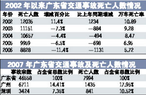 2007年,廣東省與廣州市地區(qū)均實現(xiàn)道路交通事故四項指數(shù)下降的目標和特大交通事故大幅下降的目標,創(chuàng)造了道路交通事故死亡人數(shù)連續(xù)“五年連降”的成績,2007年更是首次沒有發(fā)生一次死亡10人以上的惡性交通事故。