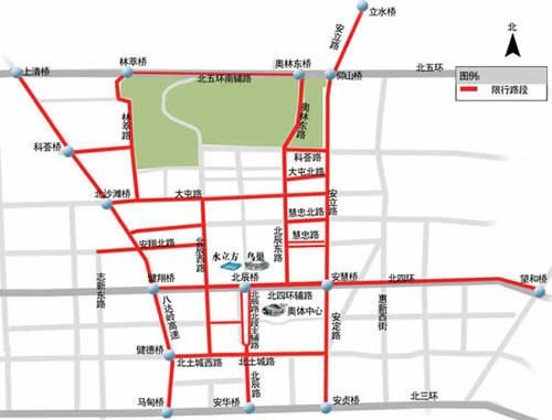限行路段:建國(guó)門橋向北經(jīng)東二環(huán)路、北二環(huán)路主路(不含輔路)至鐘樓北橋(單向);復(fù)興門橋向北經(jīng)西二環(huán)路、北二環(huán)路主路(不含輔路)至鐘樓北橋(單向),除奧運(yùn)專用車輛、公共汽車和持有閉幕式車證的車輛外,禁止其他車輛通行。