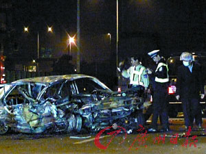 事發(fā)凌晨零時(shí)10分,相撞的兩輛私家車的其中一輛內(nèi)有3人,車右側(cè)被撞得粉碎,碎片散落一地,右邊的前輪完全凹進(jìn)去,前車玻璃也被撞破。所幸司機(jī)只受了輕傷,隨后被120接走。而另一輛車則被撞得嚴(yán)重變形,起火燃燒,只剩下鐵架。從外面看,已經(jīng)看不到里面有人。但清障車的工作人則說“里面的那個(gè)人燒成炭了”。凌晨1時(shí)30分左右,殯儀館車來到現(xiàn)場。由于車嚴(yán)重變形,車門打不開,運(yùn)政人員只好用鐵鍬把門撬開。(練情情)